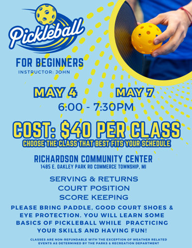 Pickleball for beginners class will focus on the basics of pickleball: score keeping, serving, returns, and court position.