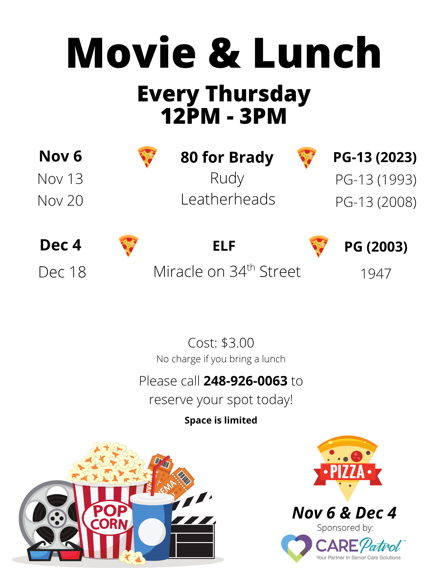 410:00 - Yoga 12:00 - CarePatrol Pizza & Movie * 12:00 - Senior Lunch 1:30 - Zumba Gold |