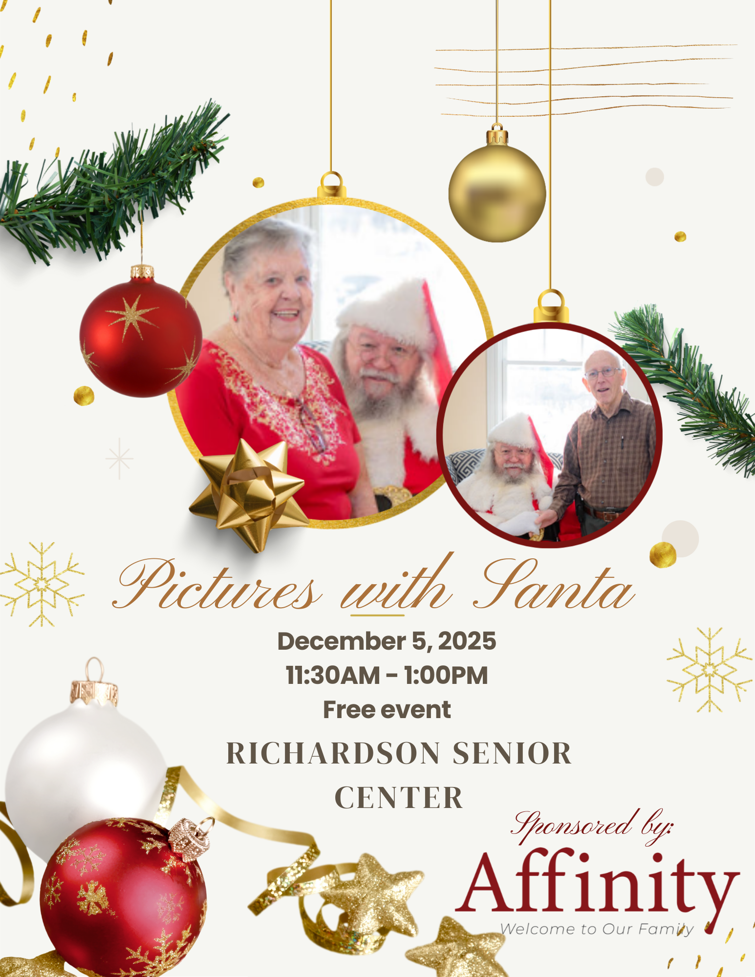 59:00 - Art 9:30 - Total Body 11:30 - Pictures with Santa* 12:00 - Senior Lunch 12:30 - Mexican Train, Bridge, & Hand/Foot/Knee