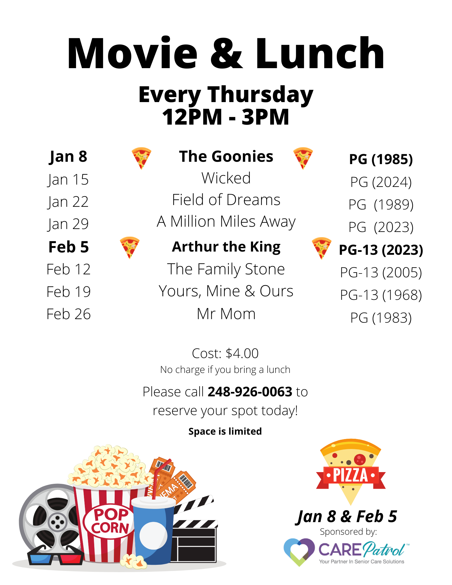 510:00 - Yoga 12:00 - CarePatrol Pizza & Movie* 12:00 - Senior Lunch