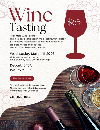 Cost includes transportation, a selection of 12 wine tastings and buffet lunch.