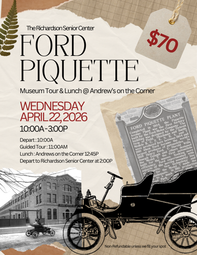 Join your friends at the Richardson Senior Center for a day trip to the Ford Piquette Plant! Visit Henry Ford’s original Model T factory built in 1904, a U.S. National Historic Landmark.  You'll enjoy a guided tour of one of the oldest surviving automotive plants led by a museum docent where you'll learn the amazing story of how Ford revolutionized manufacturing and put the world on wheels.